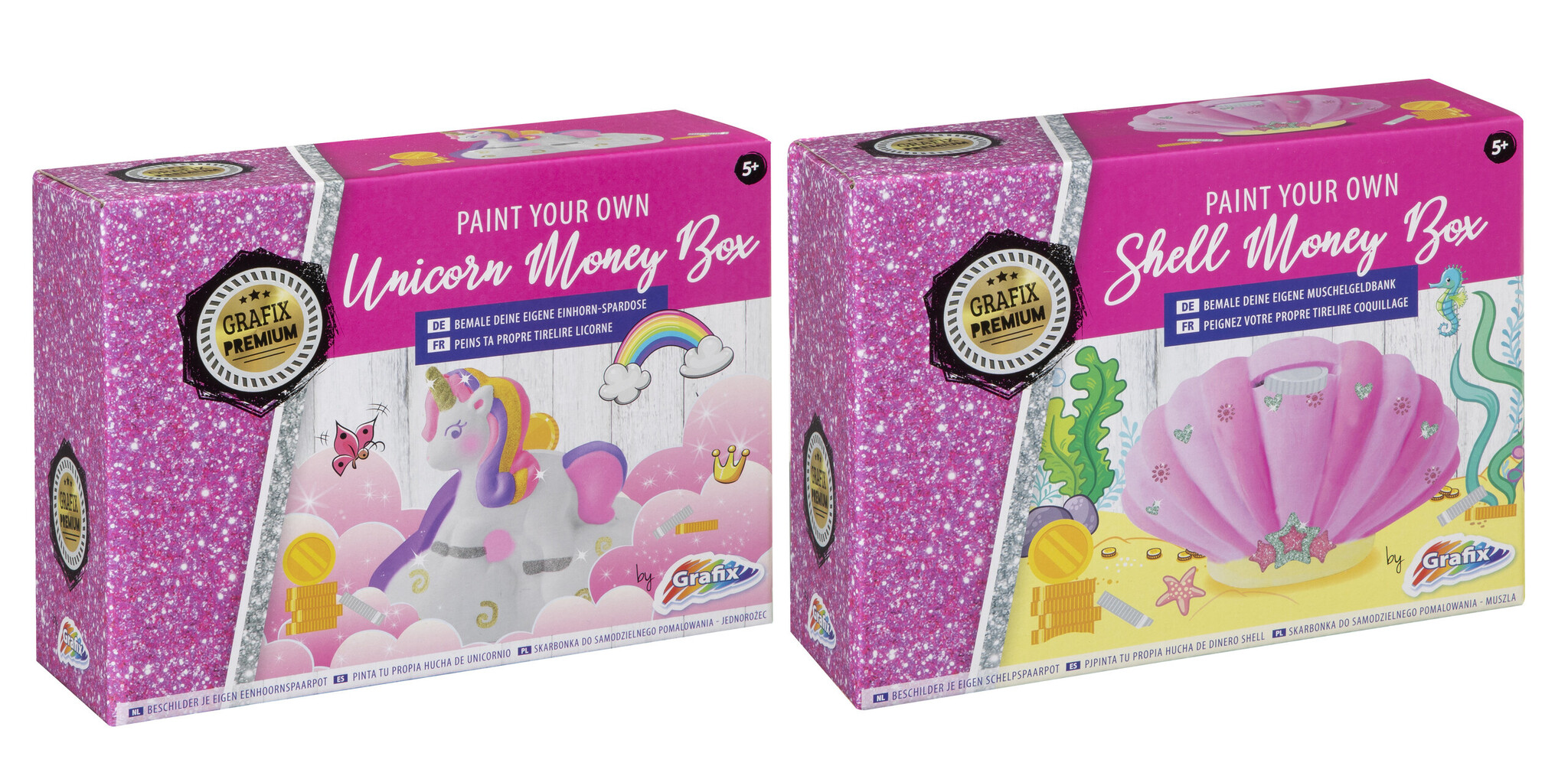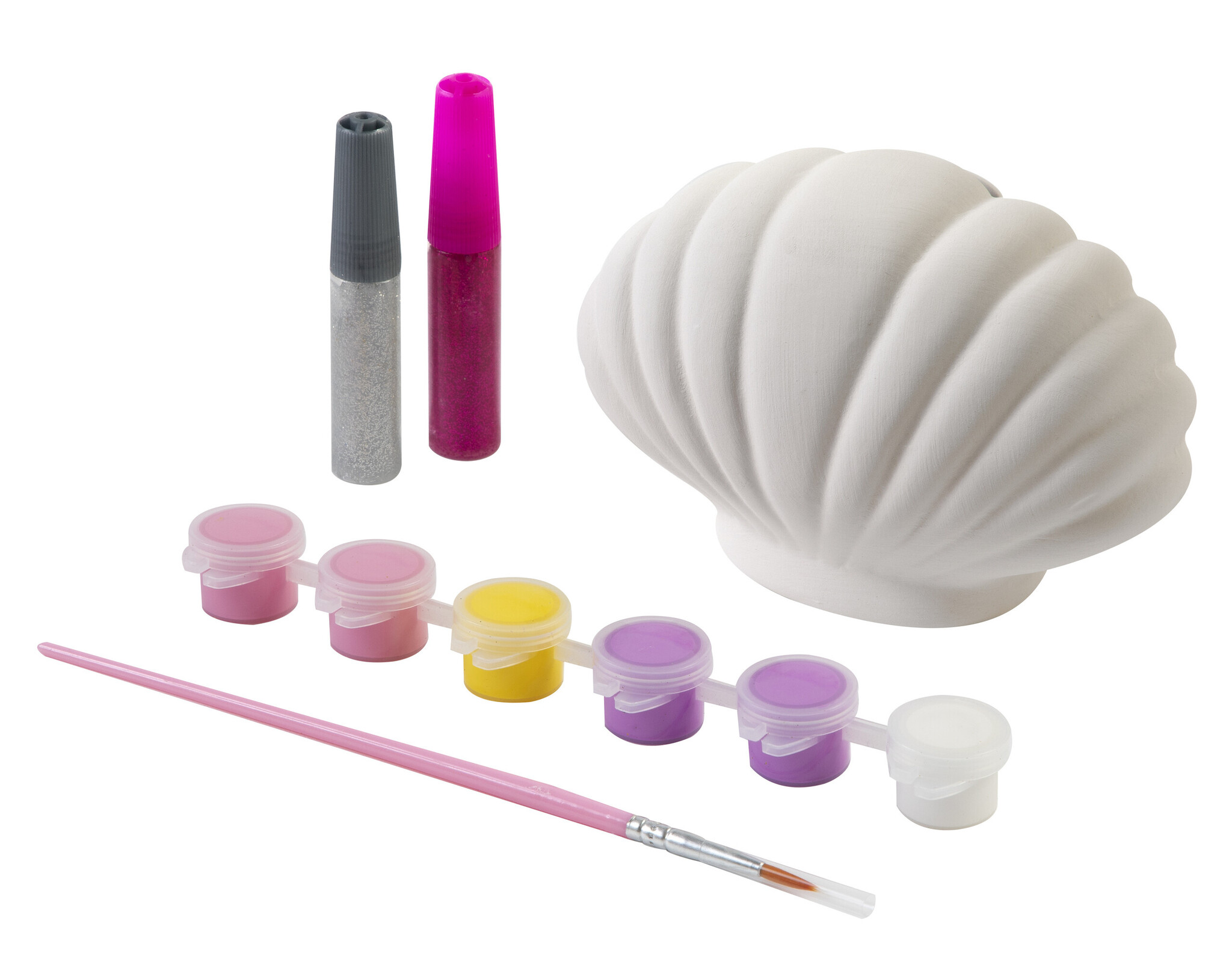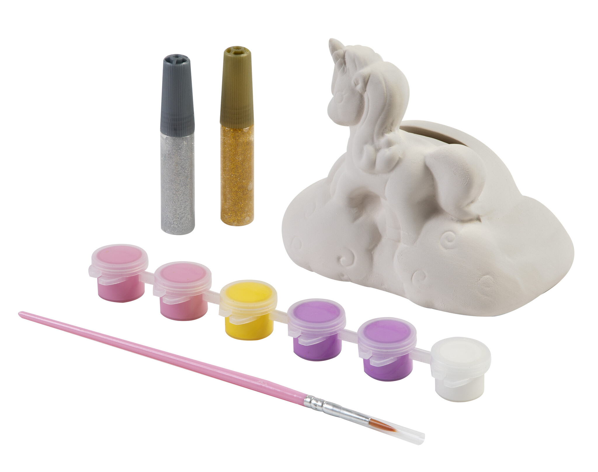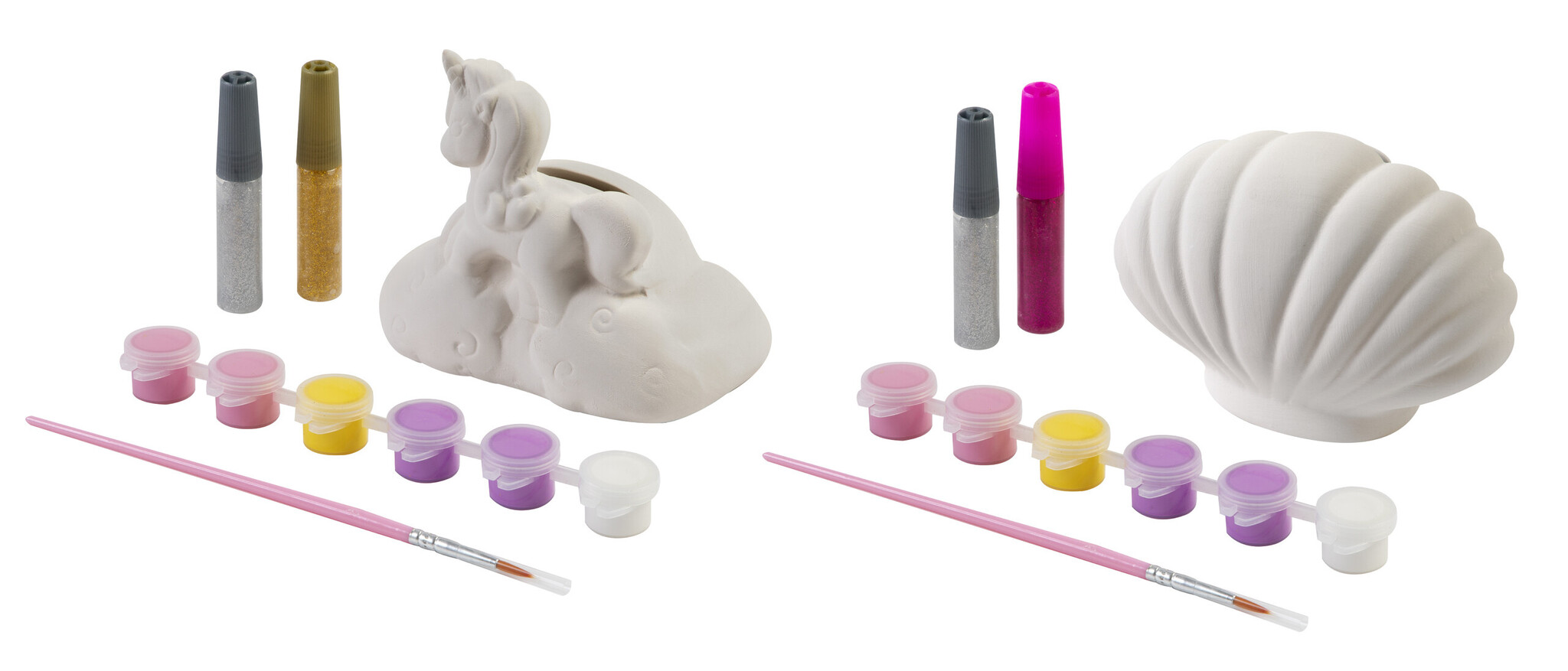 In twee uitvoeringen, schelp of eenhoorn, assorti geleverd. Inclusief spaarpot, verf, kwastje en glitterlijm.