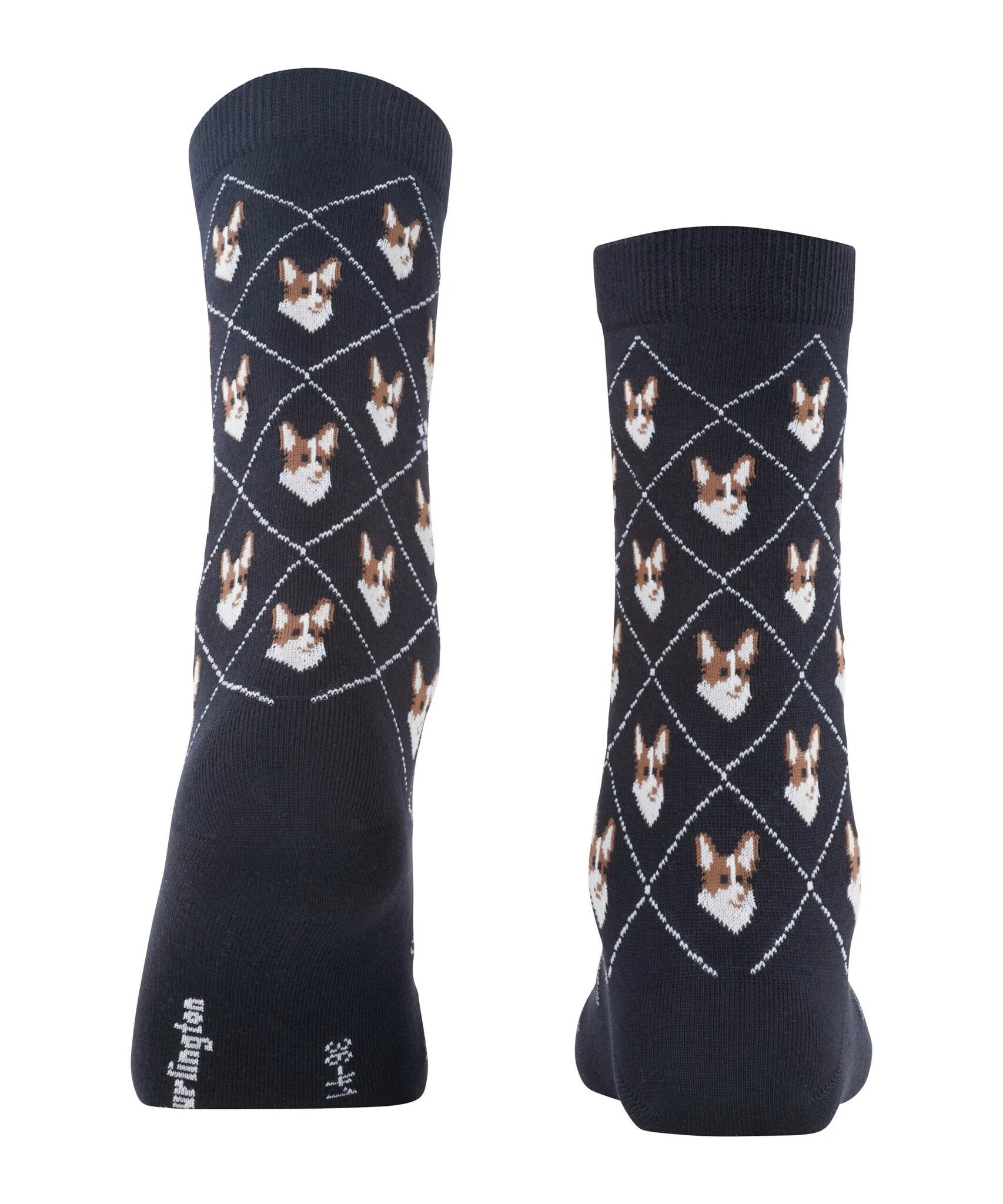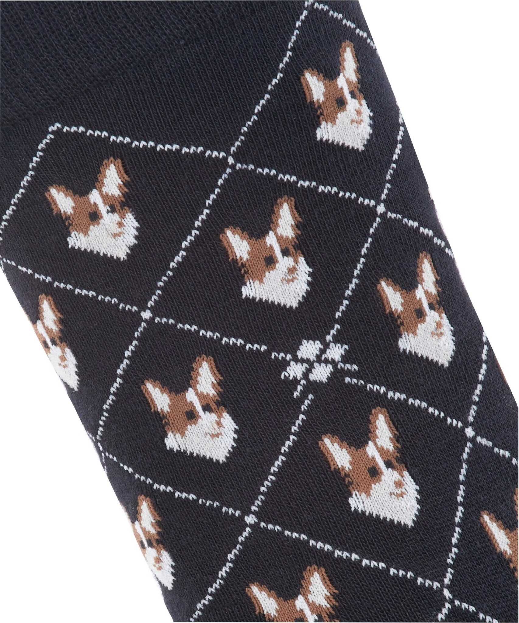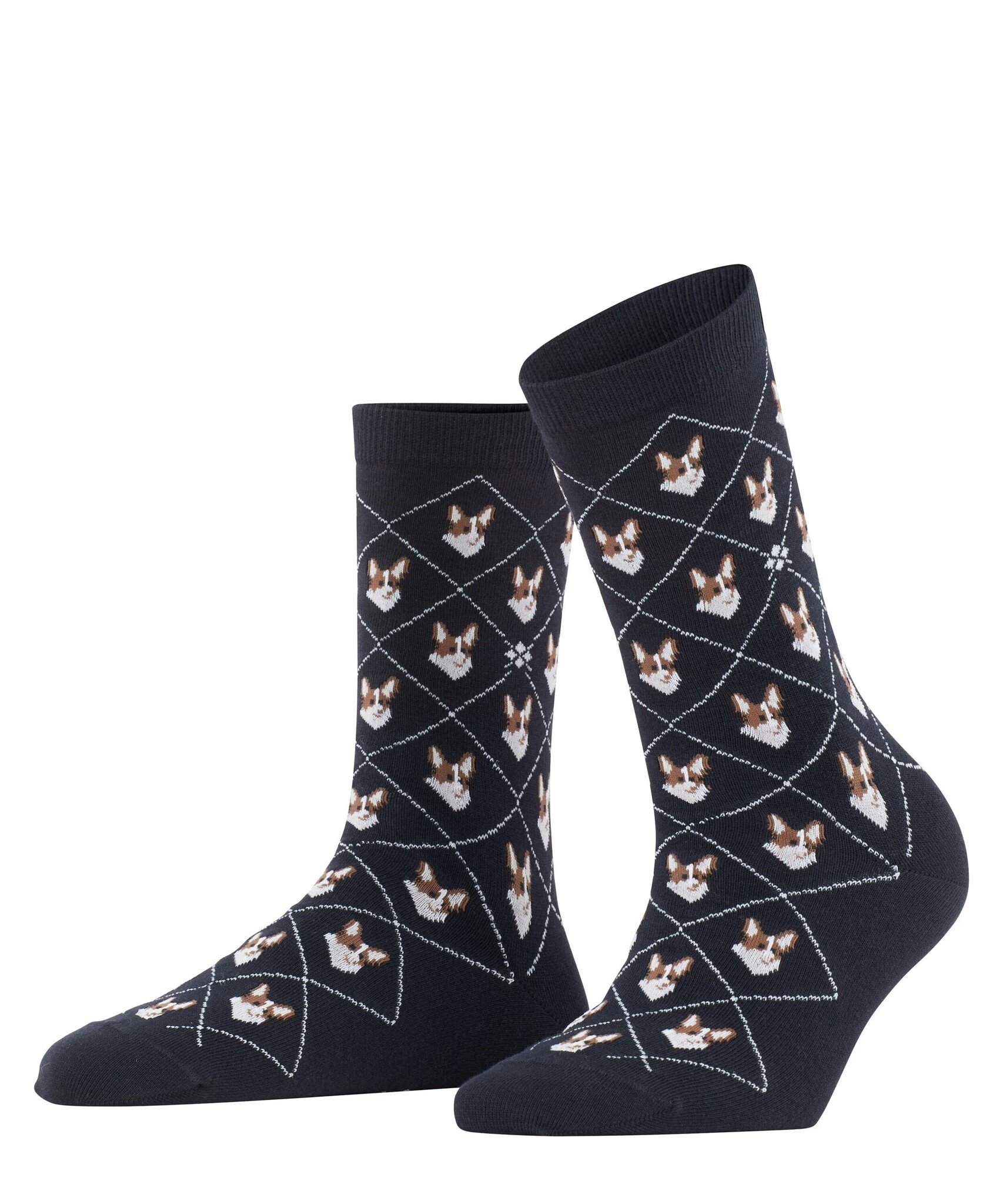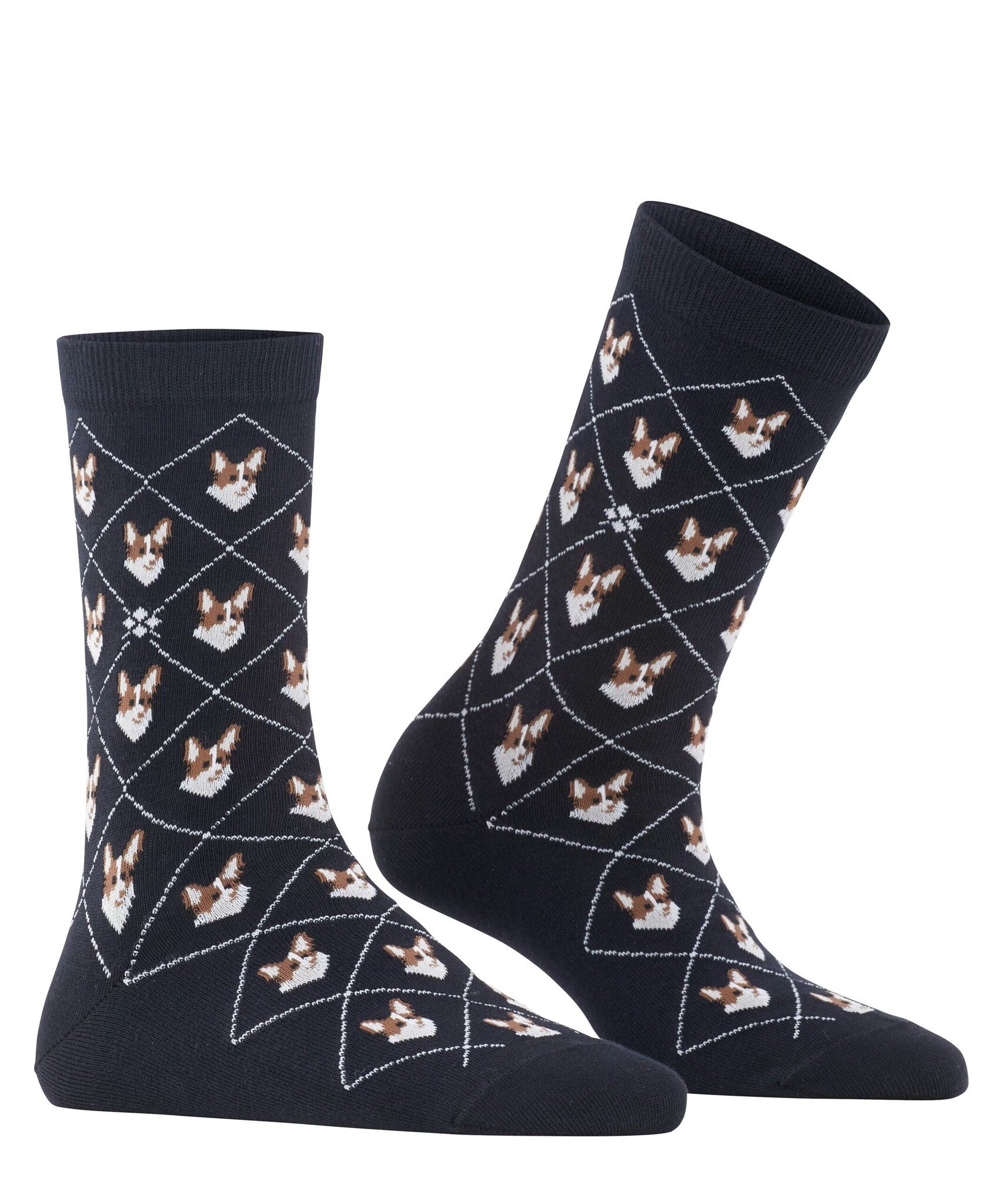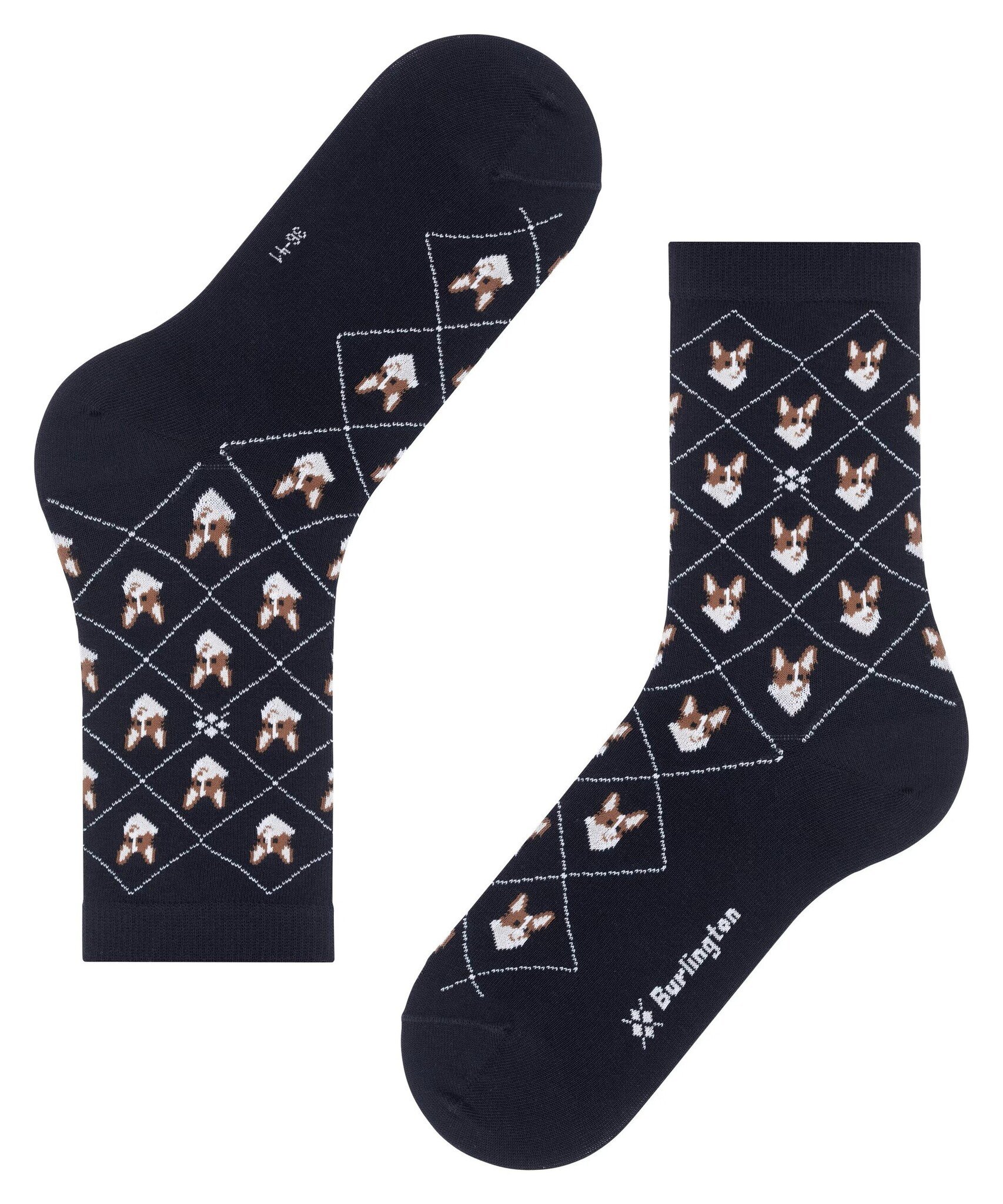 Deze sokken combineren een moderne interpretatie van het argyle patroon met een charmant corgi motief. De gebreide Burlington ruit en het fijne biologische katoen zorgen voor stijlvol comfort.