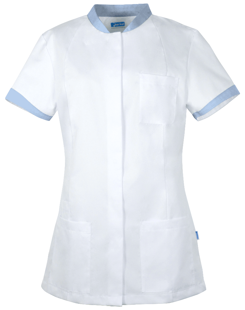 Fleur heeft een opstaande boord; verdekte drukknoopsluiting; korte mouwen met stretch inzetstukken voor meer bewegingsvrijheid; 1 borstzak; 2 zijzakken binnen met sleutel-lus, rechts met telefoonzak; zijsplitten.
