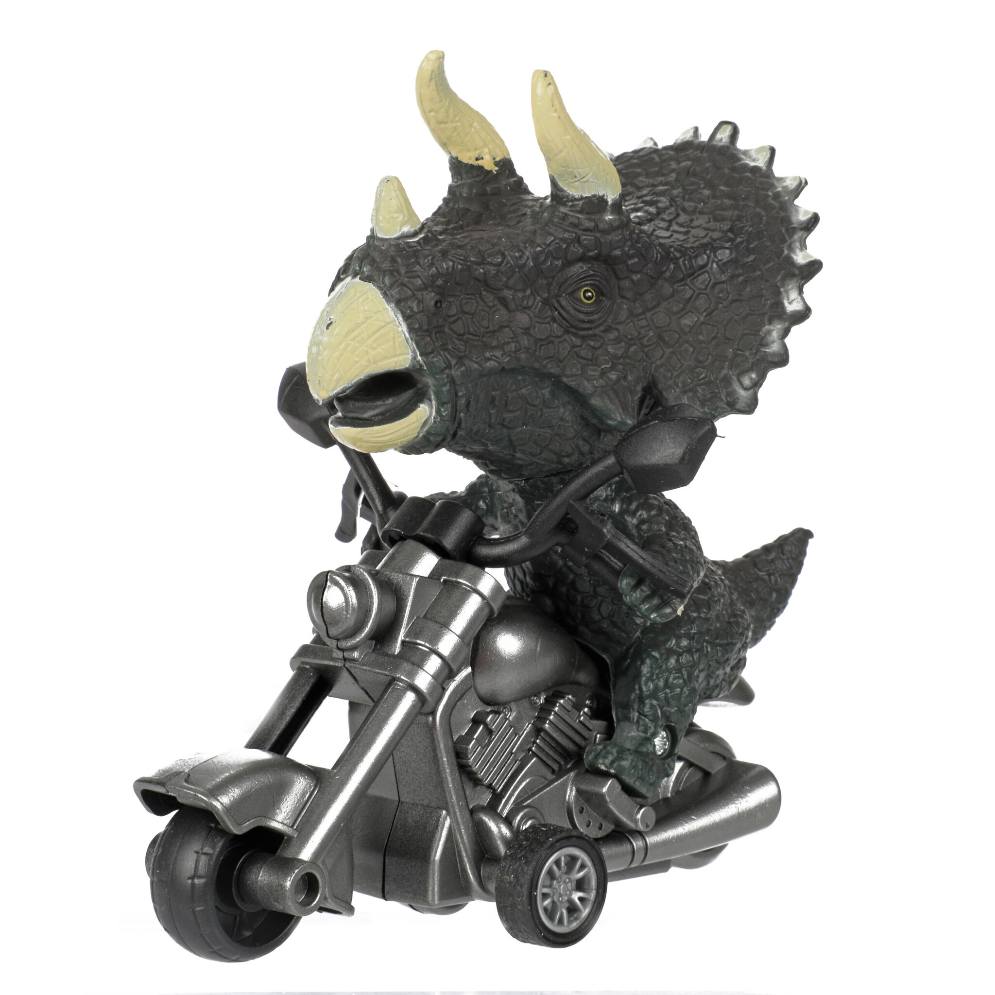 Stoer en snel! Deze dino op een motor rijdt uit zichzelf door frictie en ziet er supercool uit. Klaar voor avontuur! Afm. ca. 11 cm. Geschikt vanaf 3 jaar.