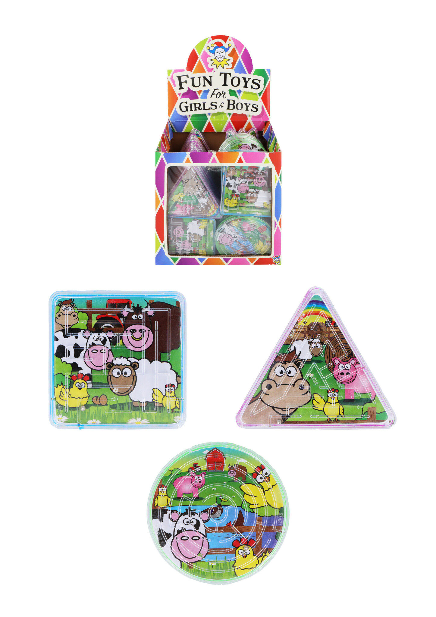 Leid het balletje door het boerderij-doolhof! Compact spelletje van ca. 6 cm, geleverd in vrolijke assorti modellen. In handige uitdeelbox geleverd.