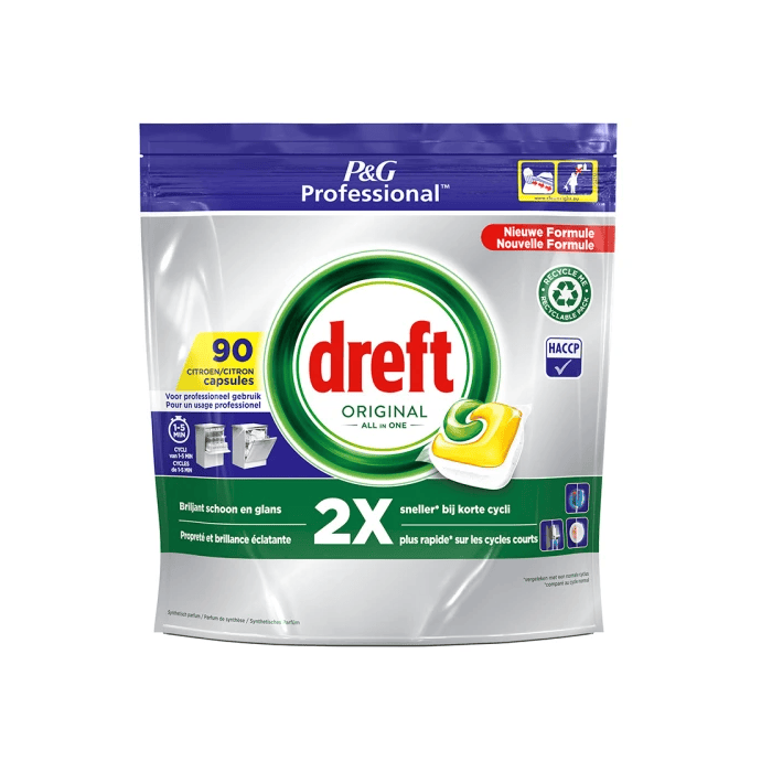 De Dreft vaatwastabletten zorgen voor een effectieve reiniging van hardnekkige opgedroogde vlekken zoals lipstick, thee, koffe etc. en houdt uw vaatwasser schoon en fris. De vaatwastablet lost snel op en is geschikt voor een korte cycusi in commerciële vaatwassers (1-5 minuten).