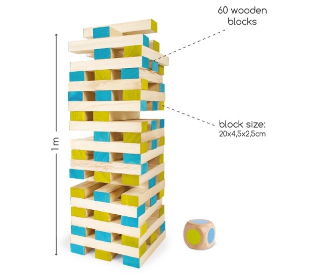Met deze blokken kun je alle kanten op! Bouw een hoge toren van maar liefst 1 meter hoog en haal er blokken uit zonder dat de toren omvalt. Je kunt ze ook gebruiken als constructieblokken. Inclusief opbergtas.