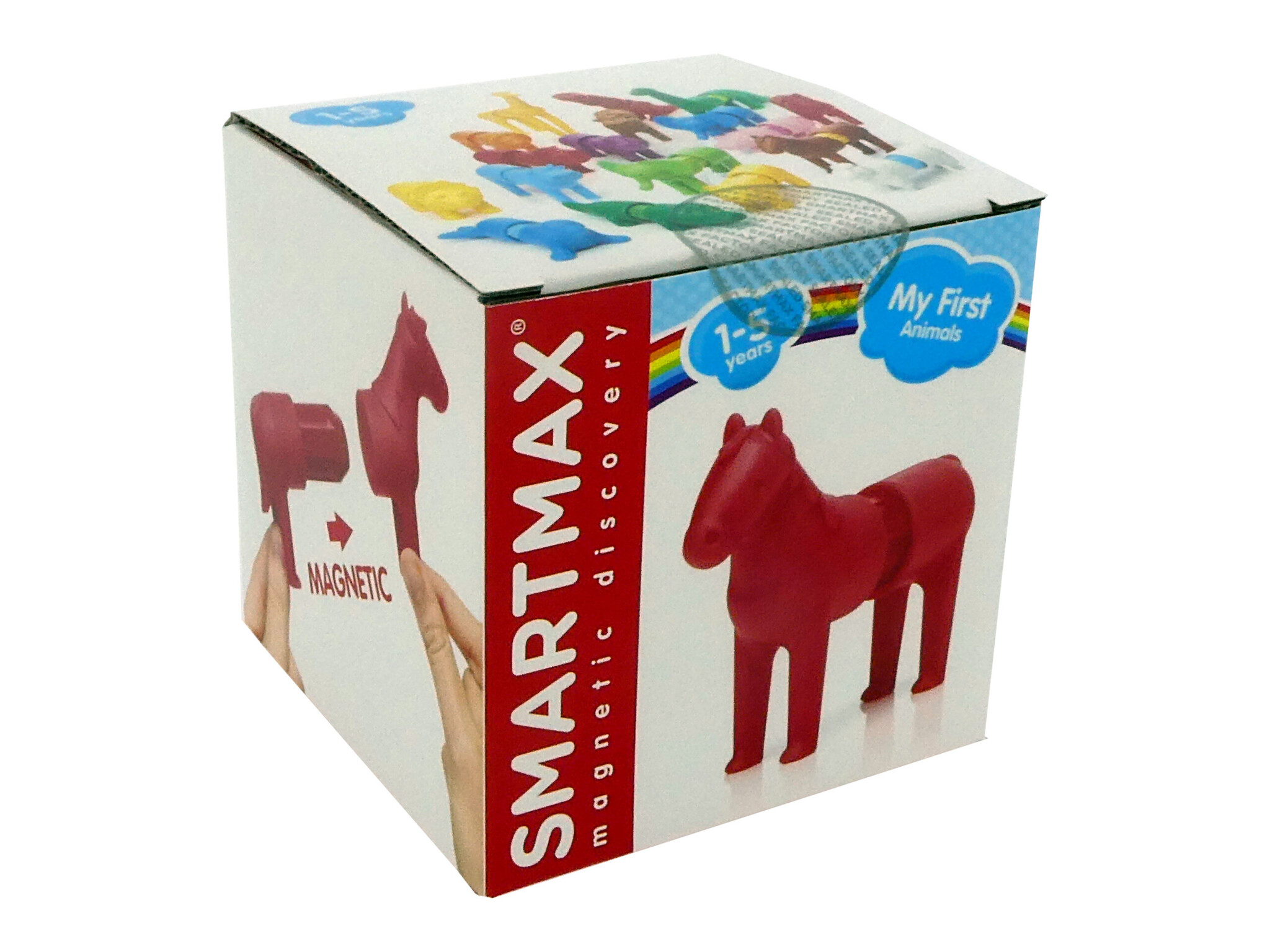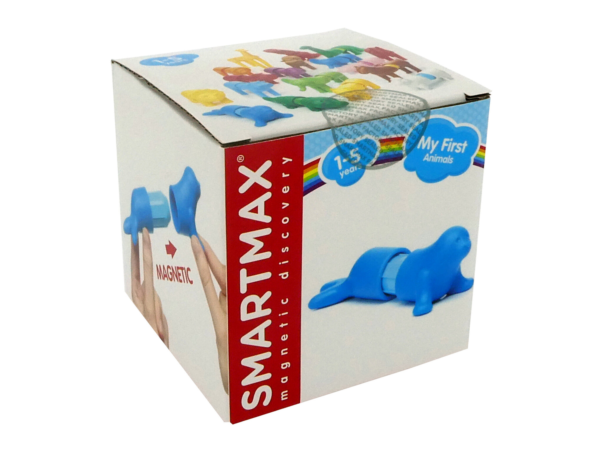 Doosje met diertje, individueel verpakt. De extra grote zachte onderdelen van de dieren klikken eenvoudig op de staven. De groene olifant, het rode paard, de blauwe zeehond en de gele beer, assorti geleverd. Afm. verpakking: 8 x 8 x 8 cm.