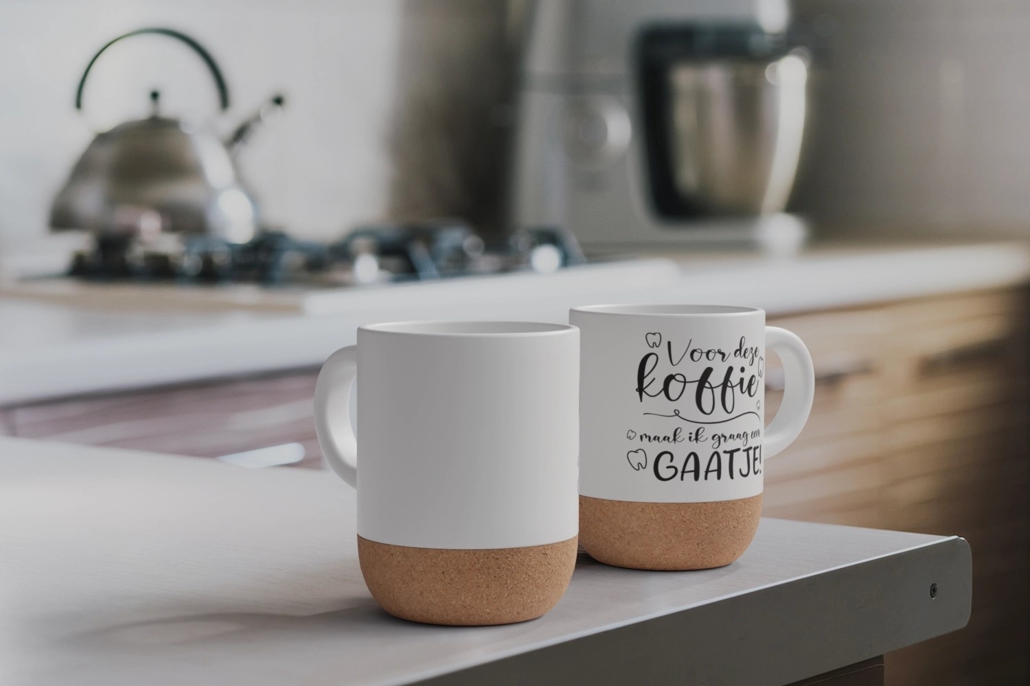 De witte keramieke mok met natuurlijke kurken onderzijde is perfect voor uw koffiemoment tussen de behandelingen door. Let op, de mok is niet vaatwasser bestendig, dus dient met de hand schoon gemaakt te worden.
