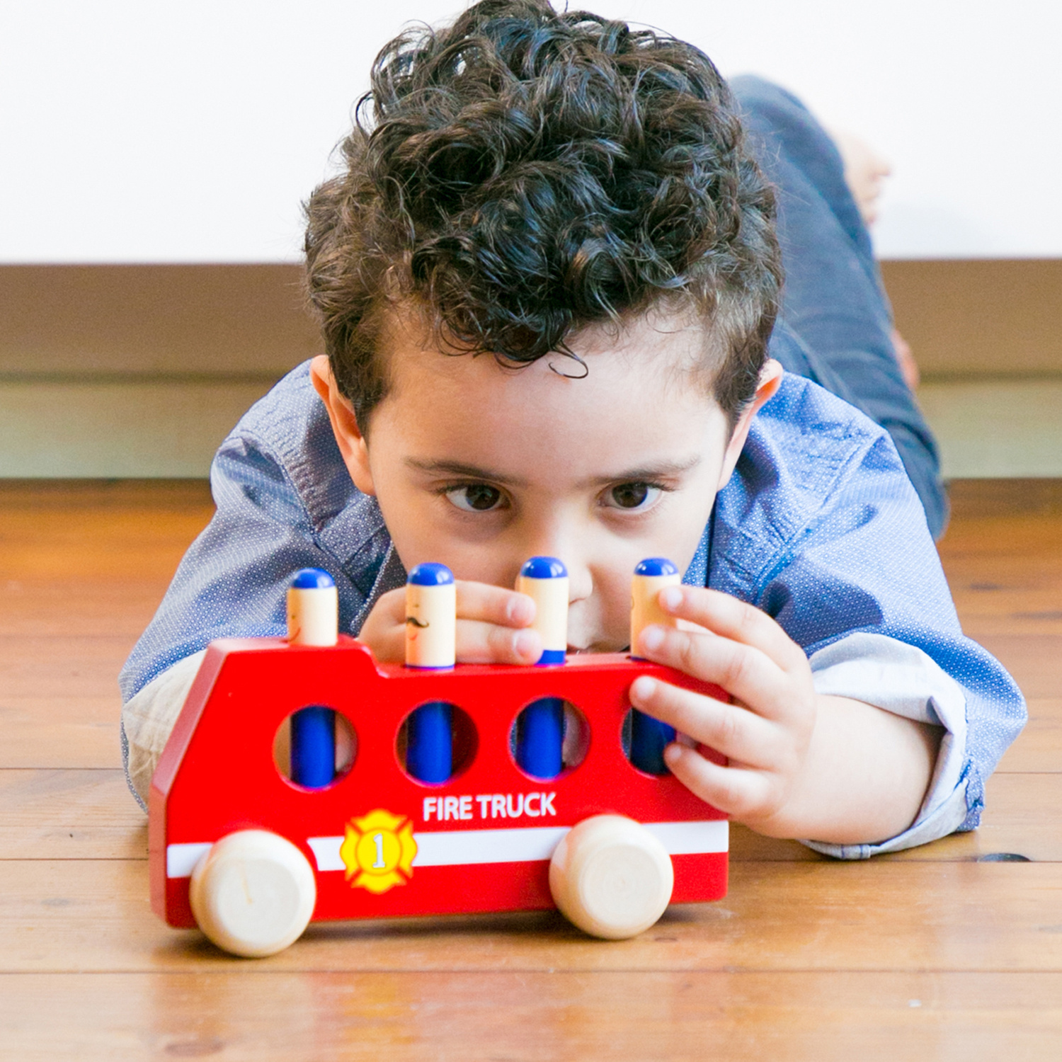 Duw, vang en speel! Deze houten pop-up brandweerauto van  belooft eindeloos speelplezier! Druk de figuurtjes naar beneden, zie hoe ze meteen weer omhoog springen en probeer ze te vangen terwijl ze door de lucht zweven.