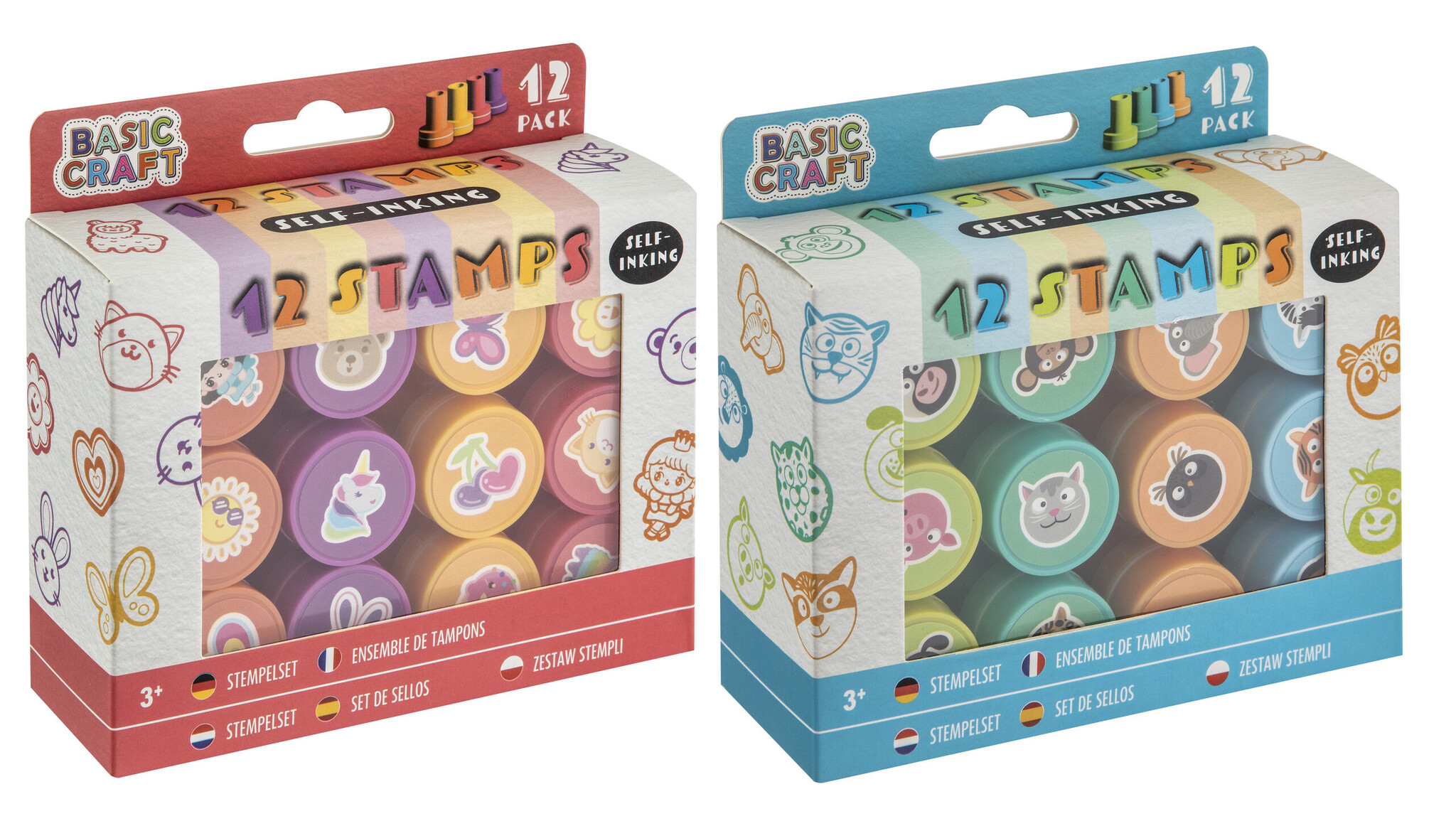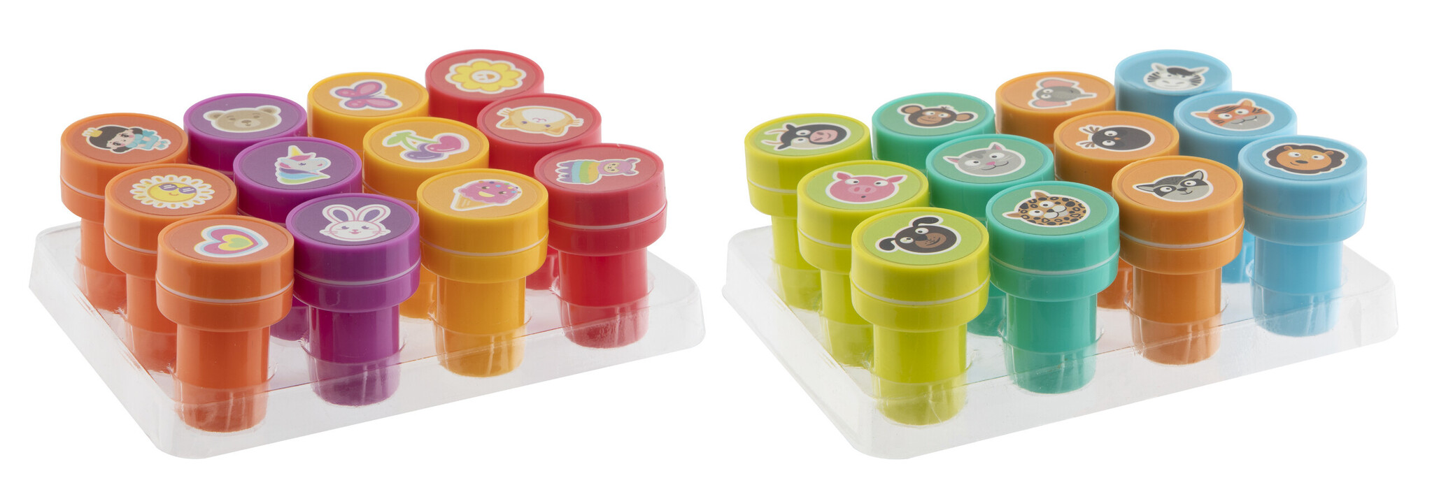 12 Mooie stempels met diverse grappige prints voor het versieren van ( knutsel) werkjes! Fraai verpakt in doosje. In 2 verschillende uitvoeringen, assorti geleverd. Afm. verpakking: 12 x 11 x 4 cm. Geschikt vanaf 3 jaar.