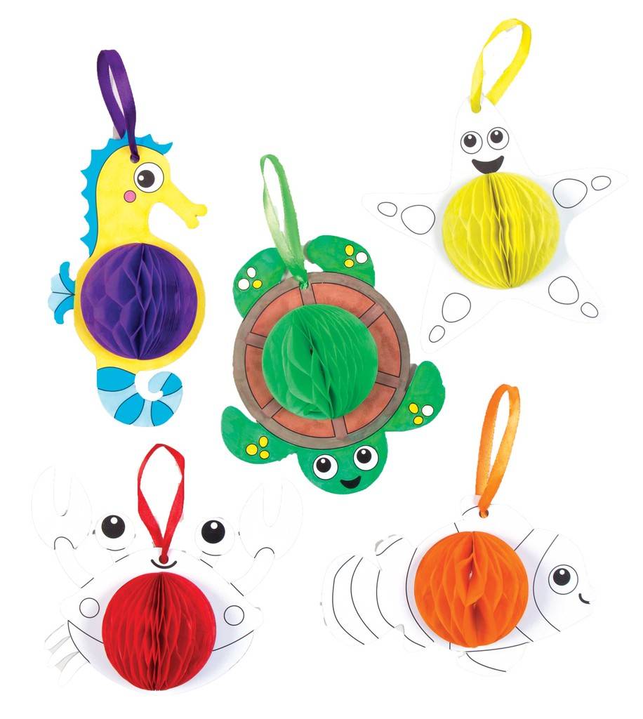 Decoreer eerst de kartonnen gedeeltes van de zeedieren en hang de decoraties daarna op! Met honingraat in middelpunt en lintje.